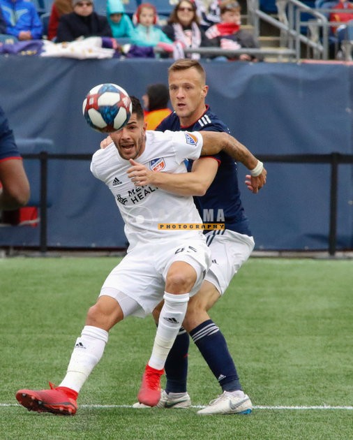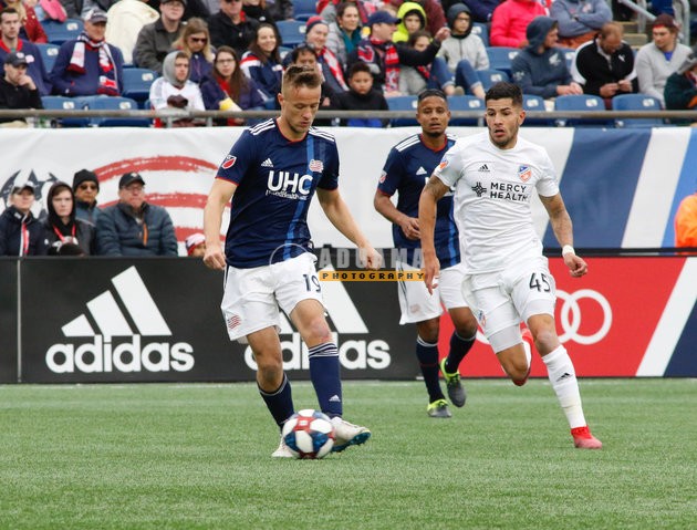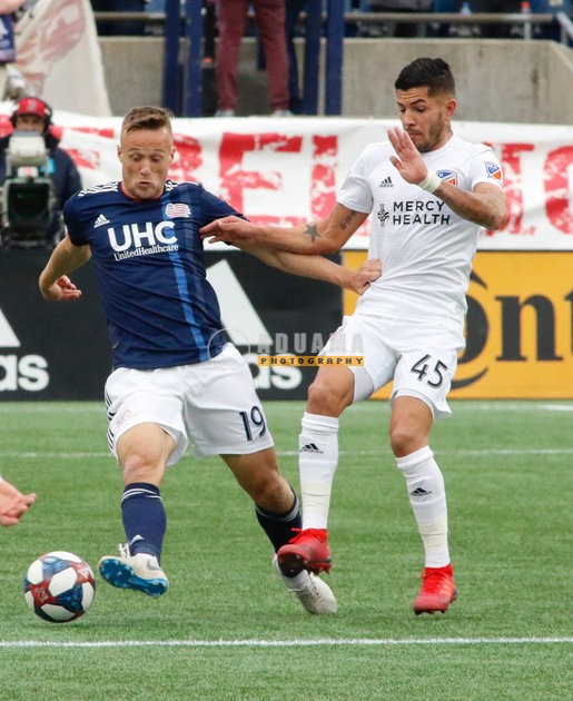 Antonio Delamea (19), Emmanuel Ledesma (45) during New England Revolution and FC Cincinnati MLS match at Gillette Stadium in Foxboro, MA on Sunday, March 24, 2019. The match ended in 2-0 win for FC Cincinnati. CREDIT/ CHRIS ADUAMA