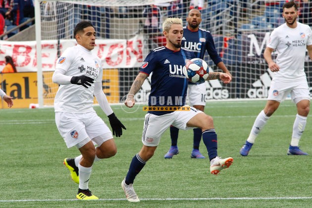 Antonio Delamea (19), Victor Ulloa (8) during New England Revolution and FC Cincinnati MLS match at Gillette Stadium in Foxboro, MA on Sunday, March 24, 2019. The match ended in 2-0 win for FC Cincinnati. CREDIT/ CHRIS ADUAMA