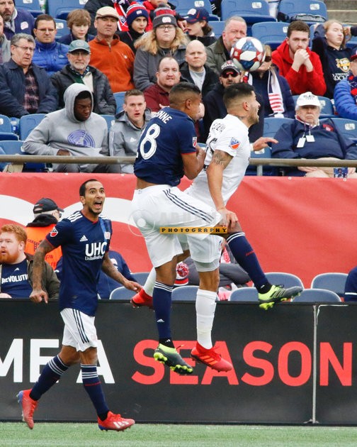 Mathieu Deplagne (17), Edgar Castillo (8) during New England Revolution and FC Cincinnati MLS match at Gillette Stadium in Foxboro, MA on Sunday, March 24, 2019. The match ended in 2-0 win for FC Cincinnati. CREDIT/ CHRIS ADUAMA
