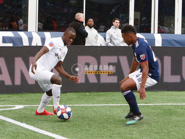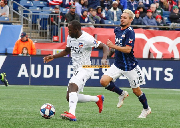 Kekuta Manneh (31), DeJuan Jones (24) during New England Revolution and FC Cincinnati MLS match at Gillette Stadium in Foxboro, MA on Sunday, March 24, 2019. The match ended in 2-0 win for FC Cincinnati. CREDIT/ CHRIS ADUAMA