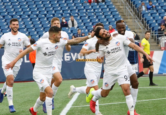 Kenny Saief (93) celebrates goal with team mates during New England Revolution and FC Cincinnati MLS match at Gillette Stadium in Foxboro, MA on Sunday, March 24, 2019. The match ended in 2-0 win for FC Cincinnati. CREDIT/ CHRIS ADUAMA
